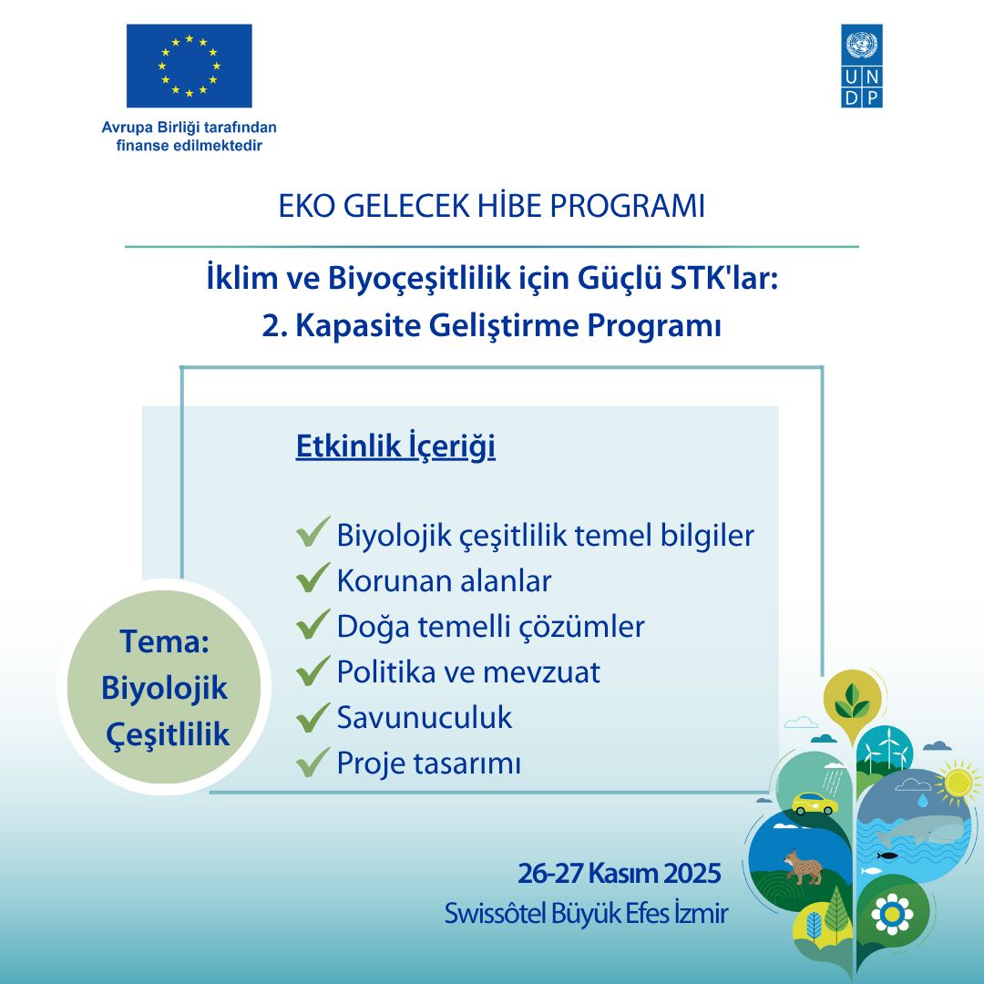 Avrupa Birliği tarafından finanse edilen ve UNDP Türkiye tarafından yürütülen Eko Gelecek Hibe Programı kapsamında düzenlenecek 2. Kapasite Geliştirme Programı, sivil toplum kuruluşlarının biyolojik çeşitlilik alanındaki çalışmalarını güçlendirmeyi hedefliyor.